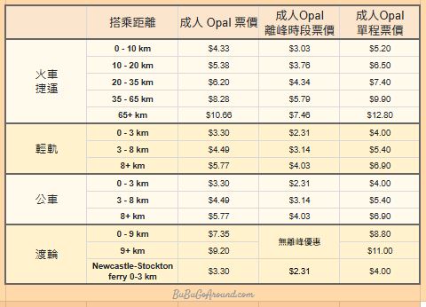 雪梨大眾運輸每種交通工具有不同的計價規則,同樣的出發點與目的地,搭乘不同的交通工具票價會不一樣,以下以成人票價給大家參考,孩童的話就是大約半價。