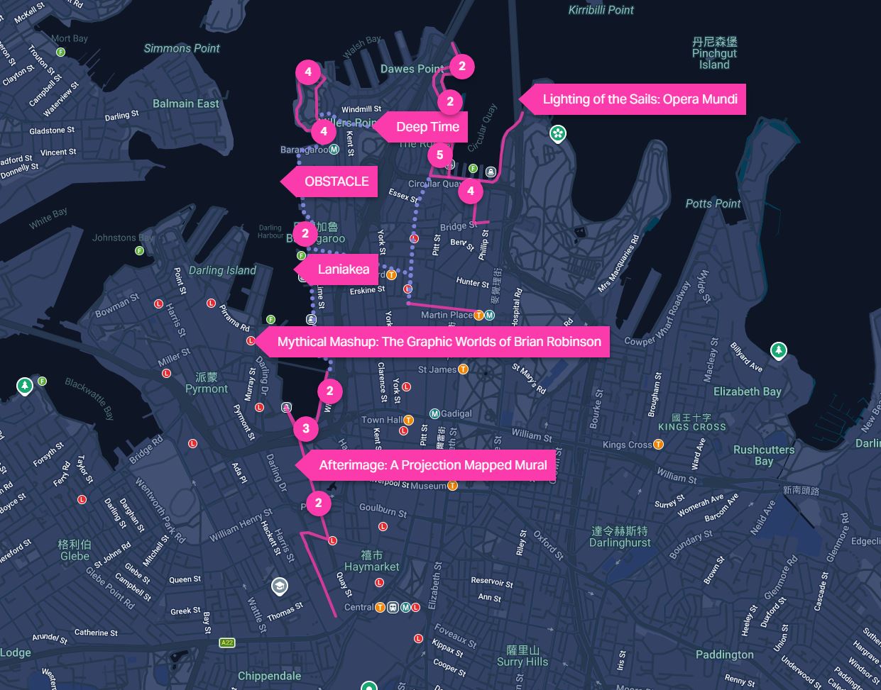 如果你的時間非常充足,可以參考上方地圖 Vivid Light Walk,從中央車站沿著裝置藝術的佈置散步到達令港、市中心、環形碼頭、巴拉加魯;那如果時間有限的話,推薦重點參觀達令港、岩石區和雪梨歌劇院,體驗一下國際級的燈光藝術活動。